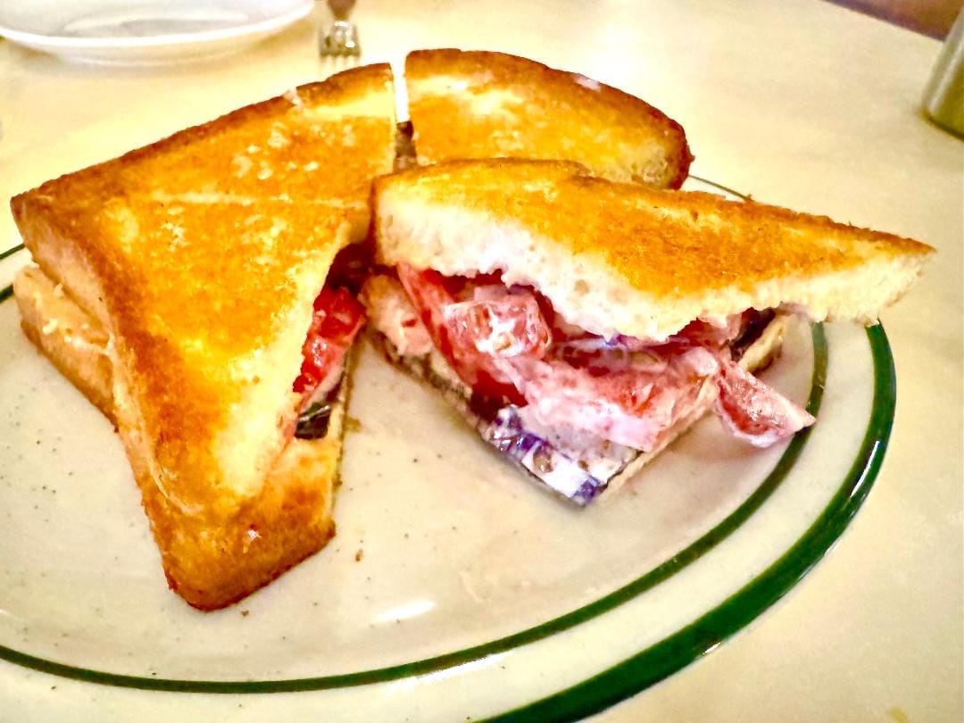 I dreamed about lunching solo on the fabulous tomato sandwich that Wong had devised as a special the night I was there: Texas toast slathered with jumpy fermented-tomato mayonnaise, packed with juicy slices of super-ripe tomato, and lined with flash-fried perilla leaves for a dark herbal twinge that seemed to come out of nowhere.