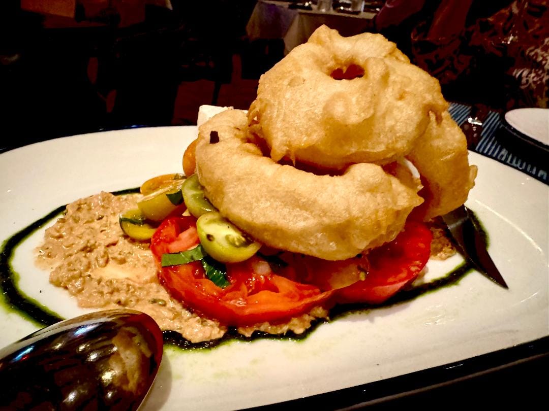 Not just any o-rings, either: these were fat, puffy tempura-fried 1015s, impeccably light and sweet. A blob of burrata came along for the ride; and a ribbon of basil oil; plus a mix of big red slicers and marinated cherry tomatoes that landed more emphatically than heirlooms often do.