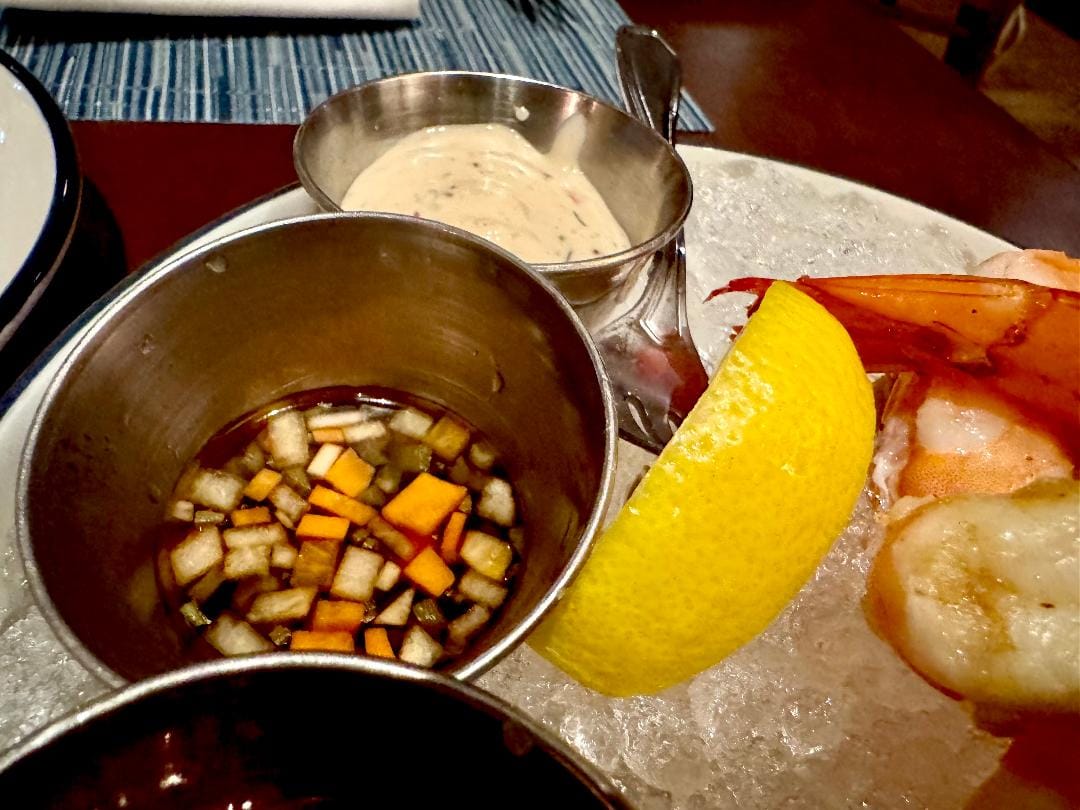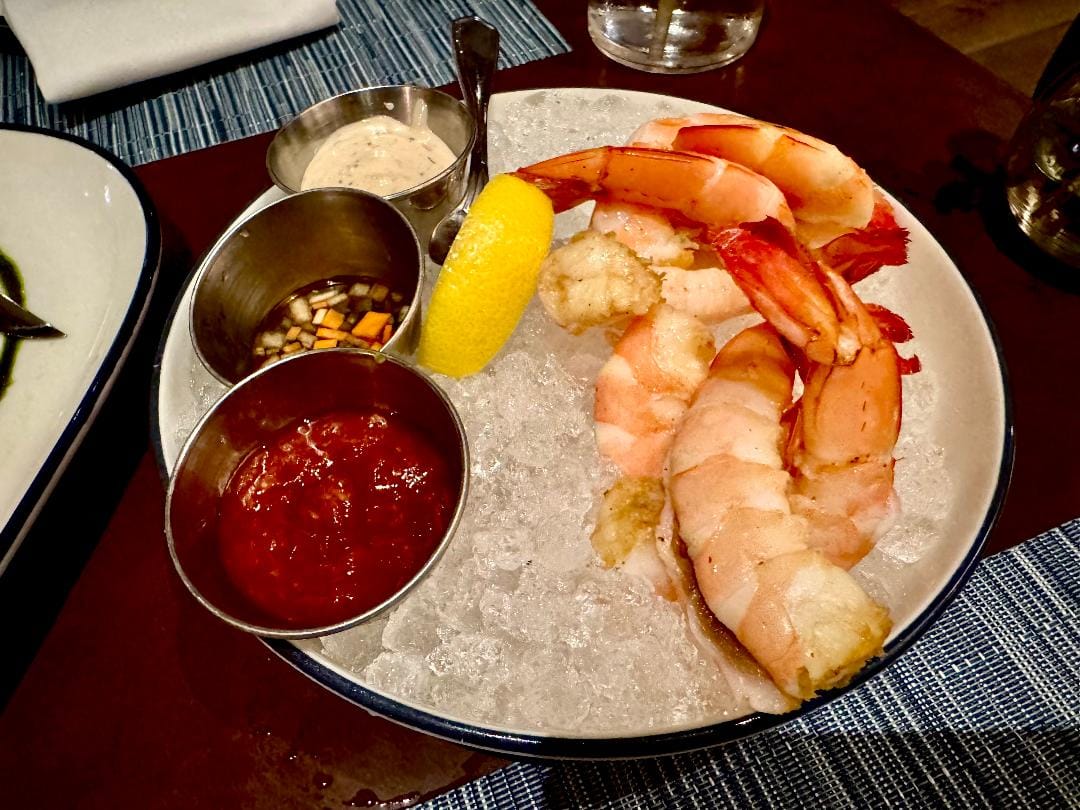 So after scarfing our pizza, what to eat next? We had already devoured a bargain-priced-at-$14 shrimp cocktail in which 6 huge, gently poached shellfish met a trio of finely detailed sauces: frisky remoulade, a twangy red cocktail dip, and a deep, grabby ponzu made with a mother sauce that Caswell has tended for 21 years. (Which dates it back to Bank, the restaurant he opened for Jean-Georges Vongerichten here at the Hotel Icon in 2004. That followed a Manhattan era when he worked for such high-flying chefs as Gabriel Kreuther and Rocco di Spirito, interspersed with stints in Hong Kong and Barcelona.)