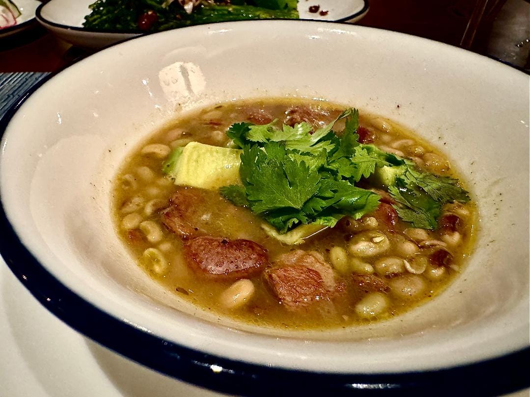 Then there was a marvelous field pea posole verde that reminded me of something Caswell might have served at Oxbow 7. Its lady cream and purple hull peas drifted in a bronze broth along with rafts of smoked pork and avocado. The soup rocked—especially with additions of pickled serrano chile wheels, sliced radish, cilantro leaves, crema and a squirt of lime from its condiment plate.