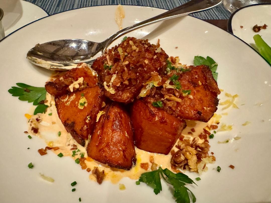Batatas bravas brought the Spanish icon home to the Gulf South: fat diamonds of sweet potato had been braised, air dried and fried in tallow until their crusts puffed, then made to jump with chile-spiked creme frâiche and a crunch of pecan-shallot cracklin.