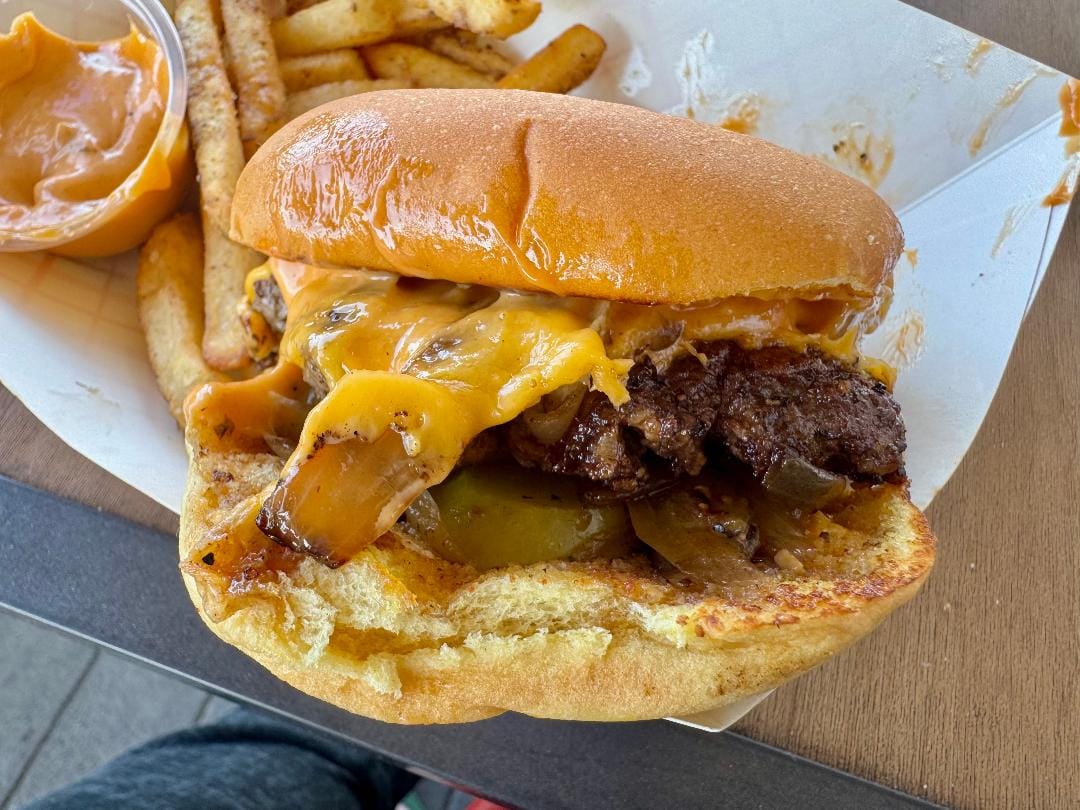 The ground beef itself is treated as a semi-smash burger, pressed down on the griddle but not squashed. The edges crackle but the interior remains moist. Okay, I could have gone for a patty cooked maybe 30 seconds less, but everything from the melty American cheese slice to the beautifully caramelized onions contributed to the burger's magic. Just when the umami threatens to make you swoon in your seat, the sharply salty and sour pickle note jumps in to revive you.