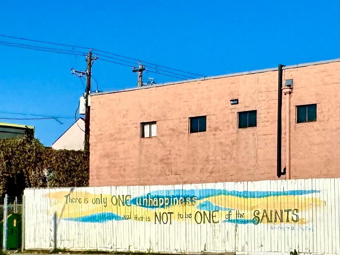 If I craned my neck, I could see the motto painted on the fence outside the nearby Casa Juan Diego. "There is only one unhappiness," it reads. "And that is not to be one of the saints."