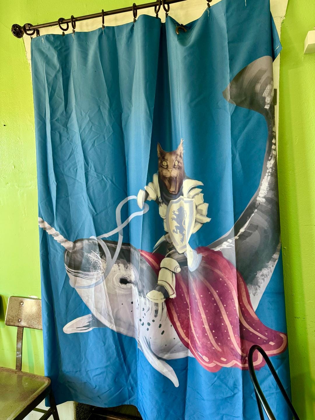 BONUS POINTS: The absurd splendor of a floor-to-ceiling heraldic drapery depicting a narwhal ridden by a maniacal cat appealed mightily to the imp in me. I am still trying to imagine where Huang and Ramos got the thing.