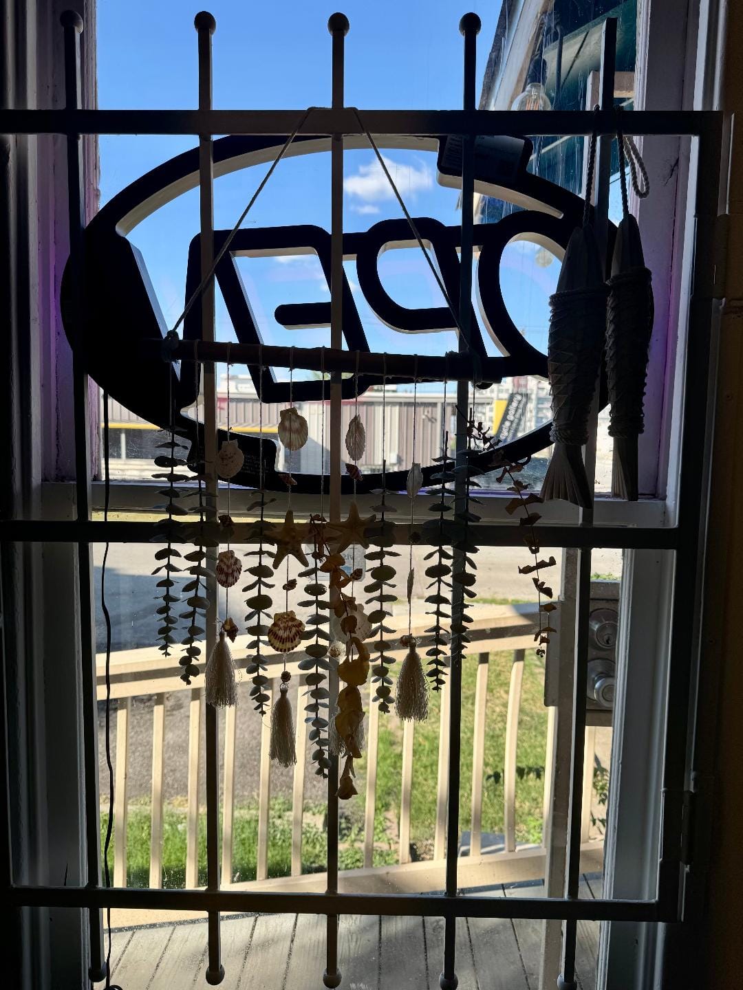 L to R from top: Narwhal Jousting Club's cheeseburger combo with fries; the marine-blue cottage housing Narwhal Jousting Club in Rice Military; Narwhal's fries with Awesome Sauce; heraldic banner at Narwhal Jousting Club; beachy bric-a-brac at Narwhal; dining porch at Narwhal Jousting Club; Narwhal's coat of arms. Photos by Alison Cook