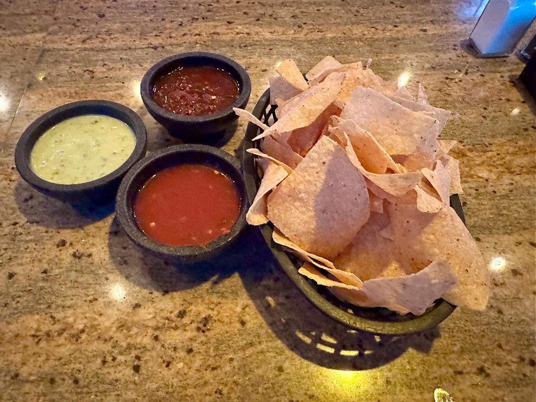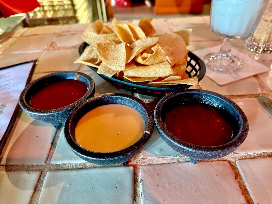 Too, I loved the two-count-em-two red table salsas that came with a basket of crackly chips, plus a reputable green salsa or (at happy hour) a cupful of runny queso. The "original" red salsa, with its tart kick, was a favorite of mine.
