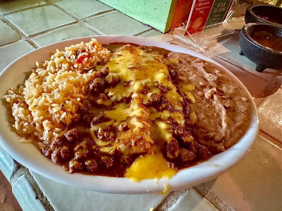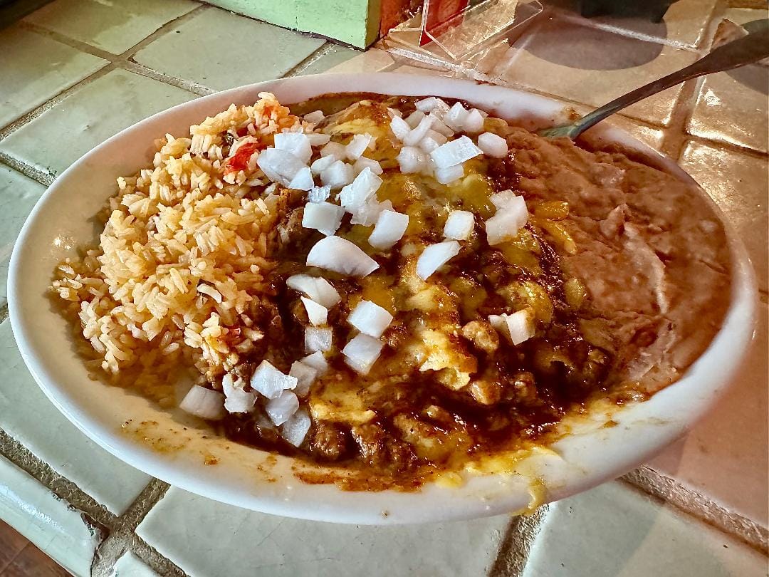 I ate them anyway, as one does. Dreaming of cheese enchiladas lost: the archetypal version at the late and lamented-by-me Spanish Village, where the rounded, grippy red-chile gravy tasted of sun and earth; the latterday version at the late and lamented-by-me HiWay Cantina in EaDo, where the chile con carne had a rich complexity I found irresistible.