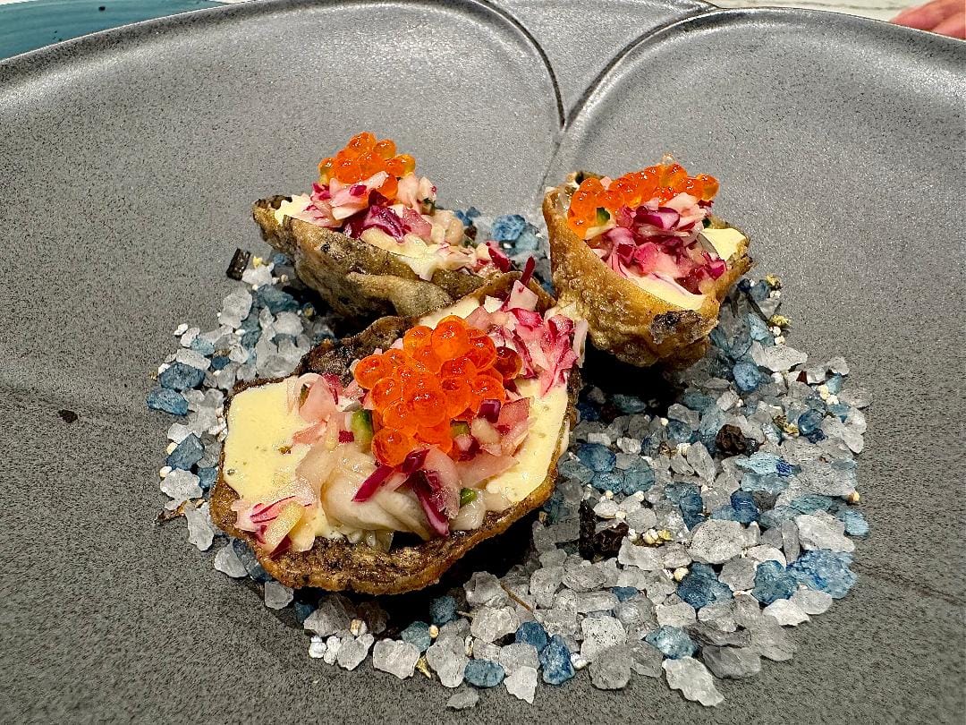 Both the "soft-shell oysters" and the baked clams played with delivery vehicles in amusing ways. The oyster "shells" were formed from a delicate masa dough tinted grey with ash, to mimic mottled oyster shells. Inside them sat a juicy bivalve swaddled in smoked oyster aioli, a lemony crunch of coleslaw and a topknot of smoked trout row. The flavors popped, but I longed for the ocean tang of the oyster to have a bigger say.