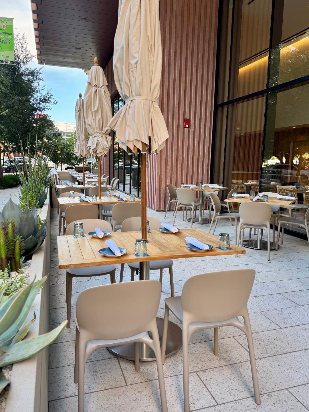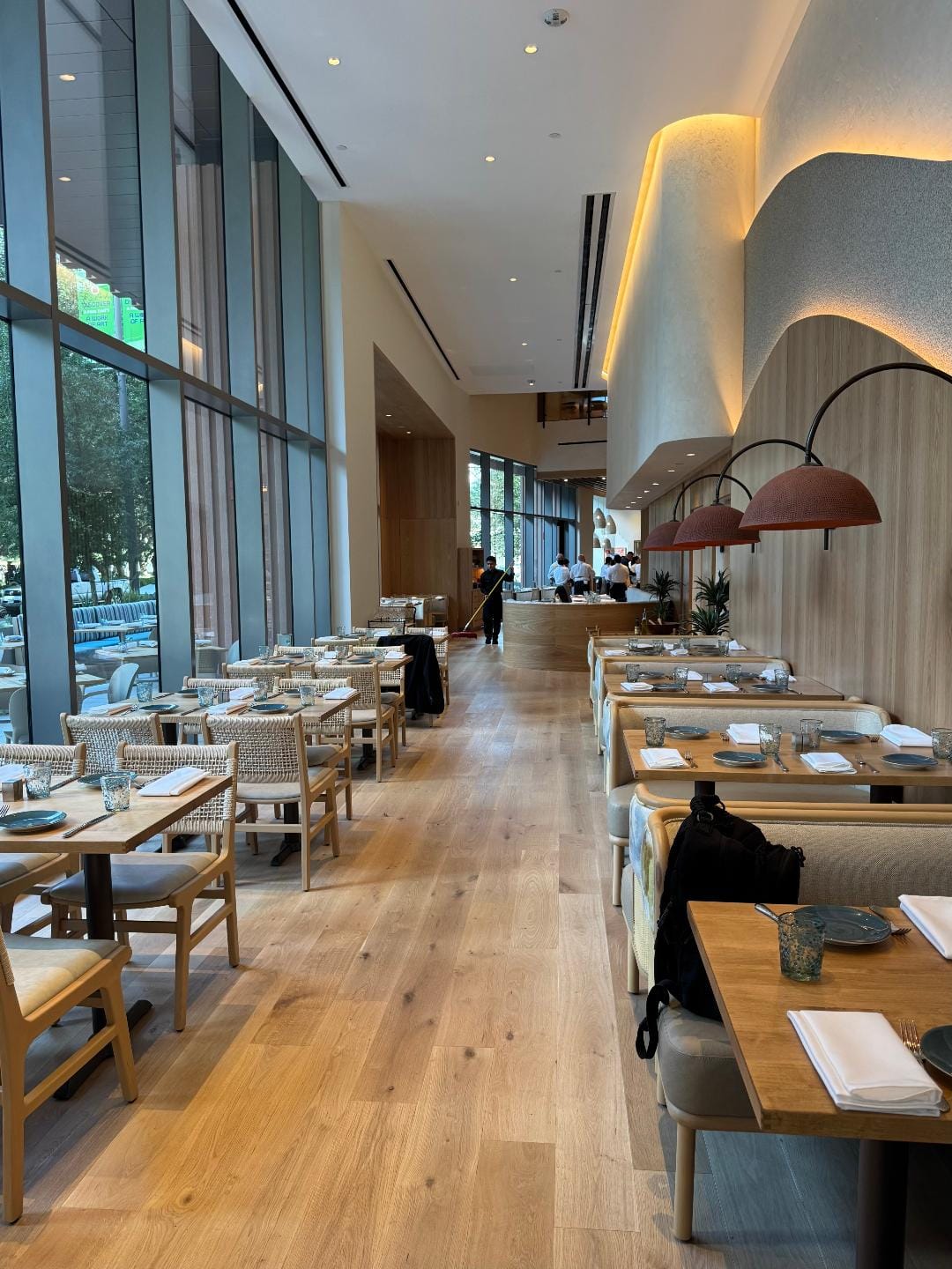 The restaurant looks sleek and sophisticated, in the fashion of Ortega and Vaught's H-Town Restaurant Group projects from Caracol onwards. An airy sweep of aisled seating leads diners into a broader dining r0om, lounge and bar area, with even more seating upstairs. Floor-to-ceiling window walls let in the light. Outside, praise be, an ample patio with a green view stands ready for Houston's mild months, which start now.