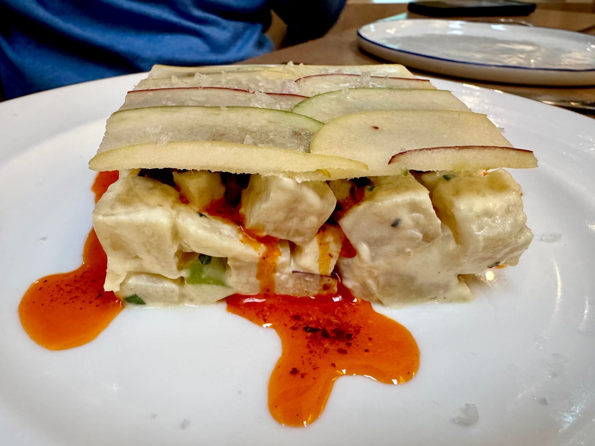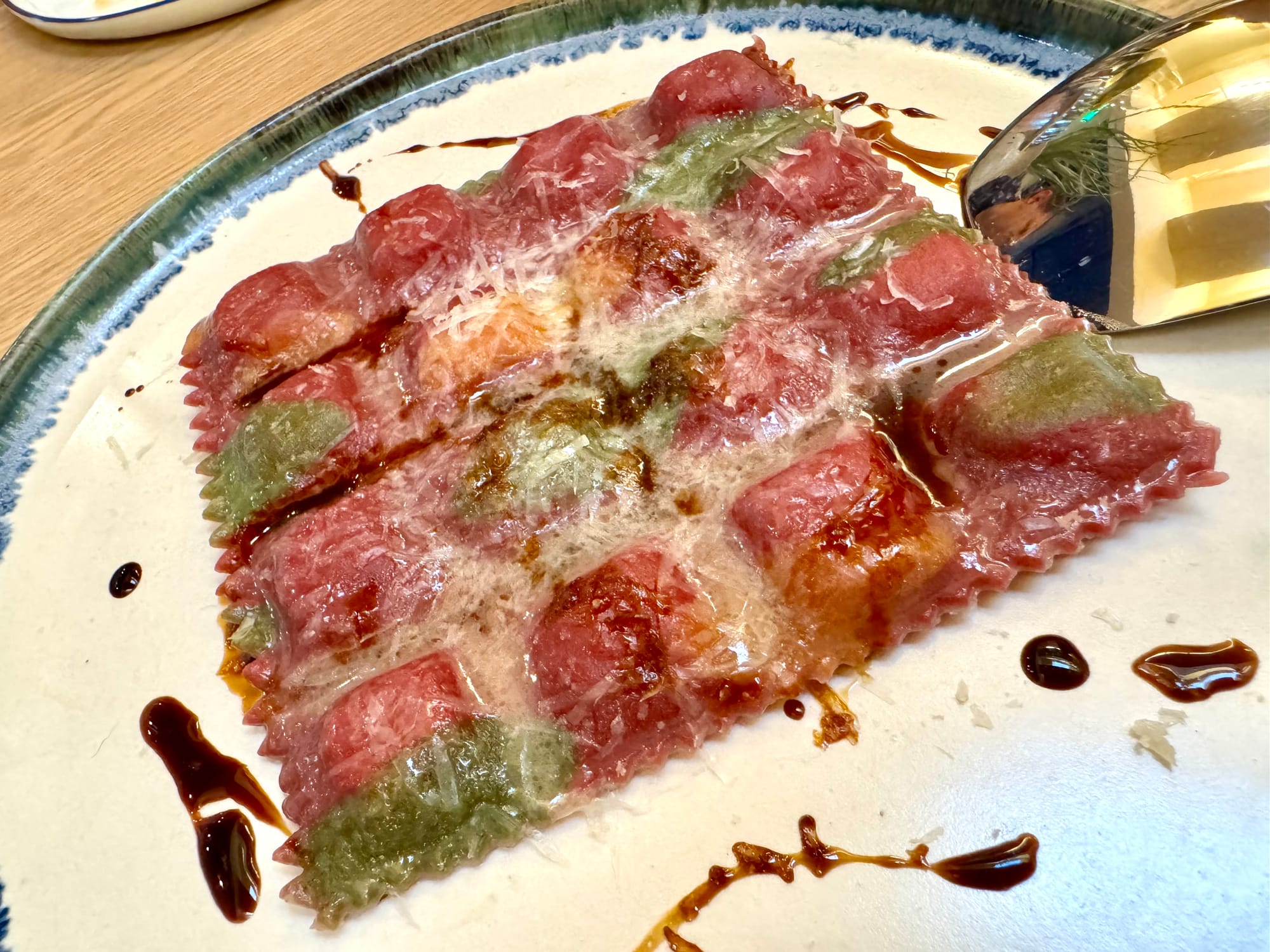 Not to mention another item I wished I had all to myself—a sheet of little French-style ravioli Dauphiné filled with nutty Comté alpine cheese and sweet caramelized onion. Just the right touch of saba, the grape-must reduction that's like a balsamic syrup, made the sweet/savory contrast vibrate. The dish looked like an edible quilt straight out of dreamland.
