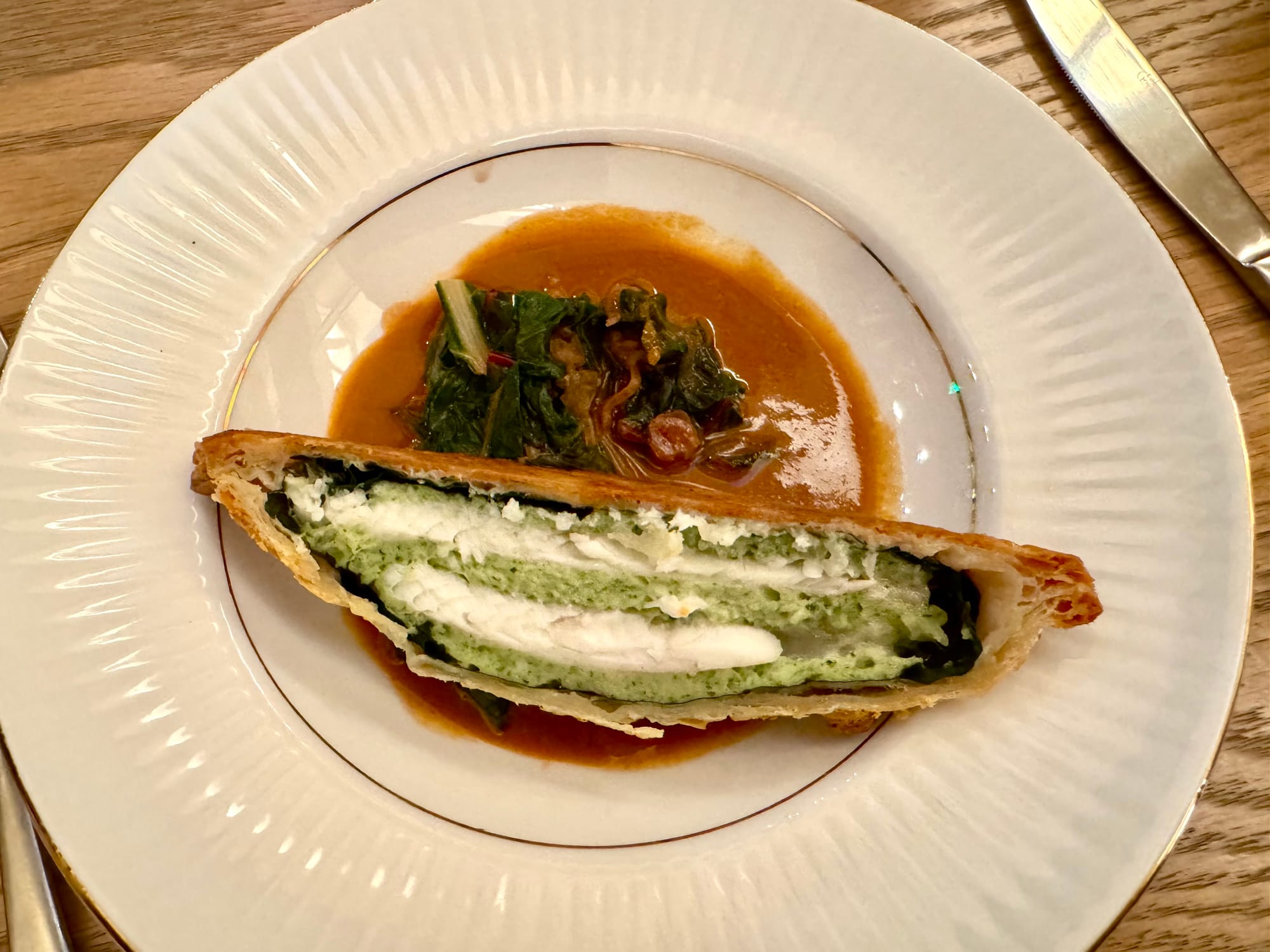 Dover sole en croûte for two is about clever technique rather than tableside ceremony. Gawle layers the fish with a verdant chard filling in a pastry crust that manages to be sturdy, crisp and tender all at once. Then he pairs it with a russet sauce Americaine in which butter and tomato meet cognac and a hint of red chile. This festive plate had lots of counterintuitive verve, but to me the sole got overshadowed.