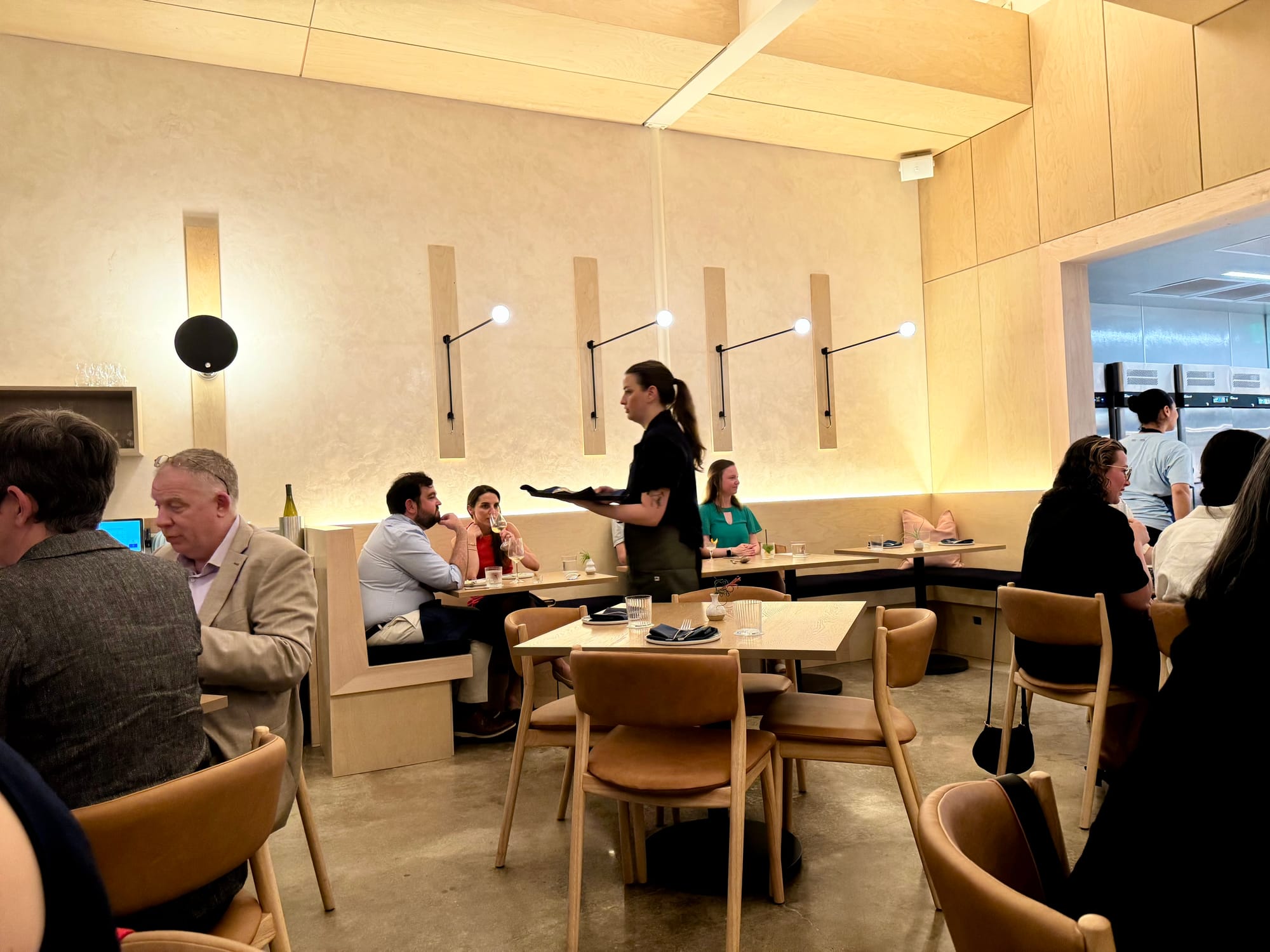 The airy dining room proper is dedicated to tasting-menu service. There the light is golden and a clerestory reaches toward the sky. Think minimalism can't feel warm? This revamp of a former industrial shed does.