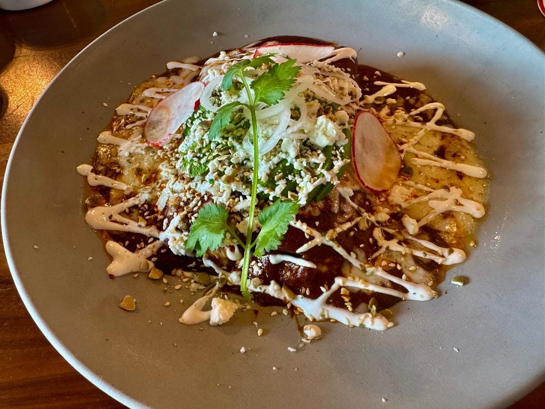 That's just the mole sauce. Inside the three tortilla cylinders dwell irregularly torn shreds of carefully roasted chicken. On top rides a cargo of fresh tastes, textures and temperatures: a soft pavement of thin-sliced avocado; whisper-thin radish disks; squiggles of cool crema and warm melted white cheese; yielding crumbles of queso fresco; chopped scallion, ringlets of crisp white onion and a leafy sprig of cilantro; the itty bitty crunch of sesame seeds.
